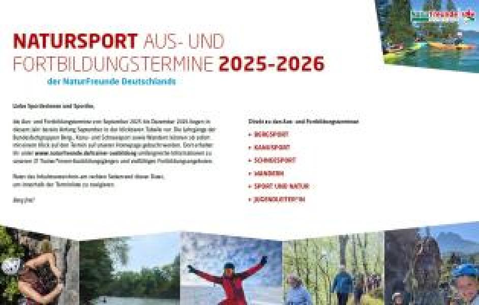 Kinderleicht werden Kursauswahl und -buchung durch die klickbare PDF-Tabelle „Natursport-Aus- und -Fortbildungstermine 2025/26 (hier Download als PDF-Datei). Mit nur einem Klick auf eine Terminzeile gelangt man direkt aus der Tabelle zum Lehrgang auf naturfreunde.de und kann sich gleich anmelden. Das Natursport-Ausbildungsangebot der NaturFreunde Deutschlands bietet qualitativ hochwertige Aus- und Fortbildungsmöglichkeiten im Bergsport, Kanusport, Schneesport und Wandern. Die Lehrgänge richten sich sowohl an ambitionierte Natursportler*innen, die an einer Trainer*in-Ausbildung interessiert sind, als auch an Trainer*innen, die sich in ihrer sportlichen Disziplin – oder einer anderen Sportart – weiterbilden möchten.